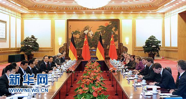 2月2日,国务院总理温家宝在北京人民大会堂与来访的德国总理默克尔举行会谈。会谈前,温家宝为默克尔访华举行欢迎仪式。新华社记者 谢环驰 摄
