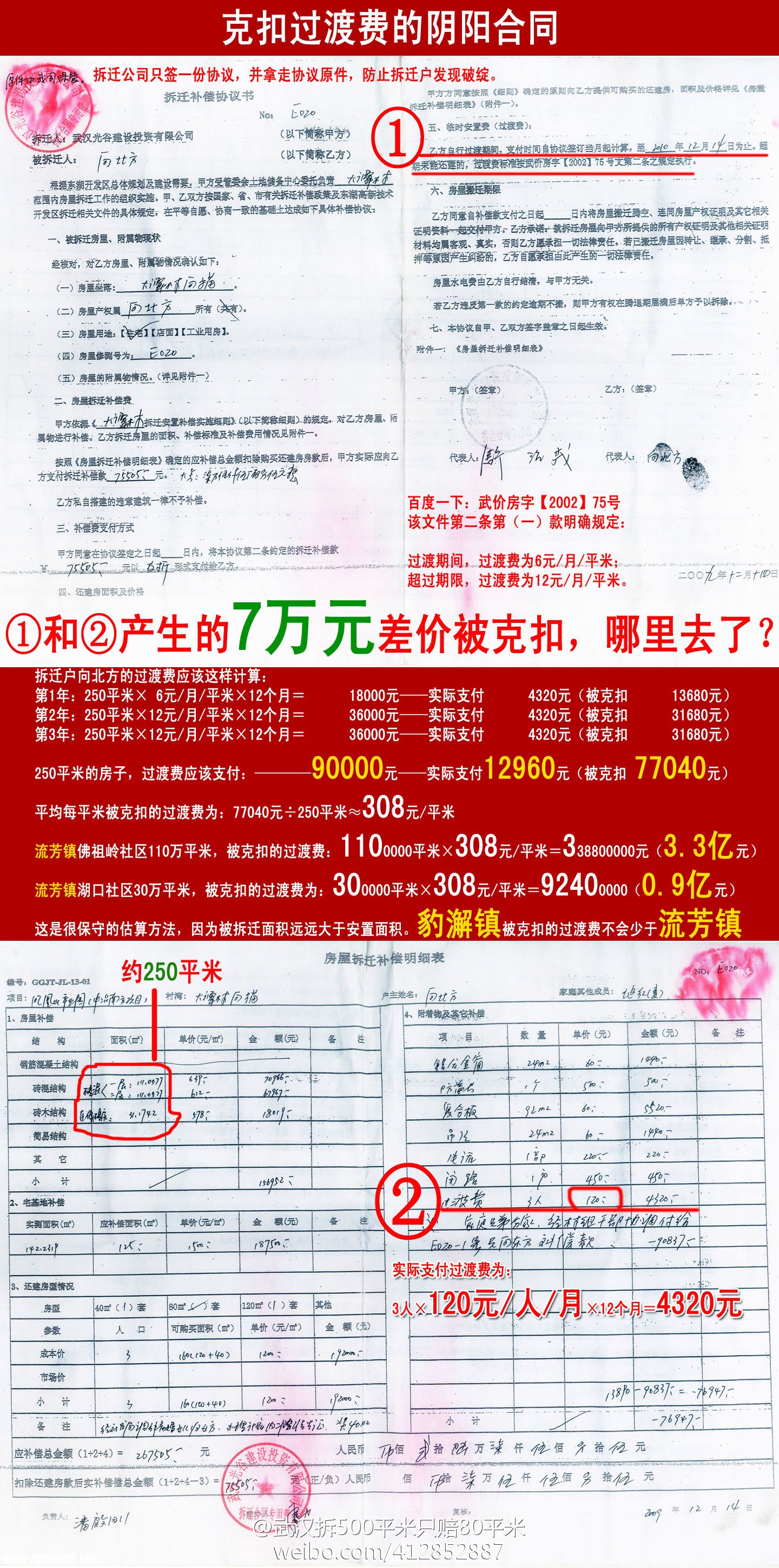 @武汉拆500平米只赔80平米:【微博举报二】拆迁“阴阳合同” 明确约定:按①——武价房字【2002】75号计算过渡费,实际按②——120元/人/月赔偿。两种计算方法产生了巨大差价:拆1户250平米的房子被拆迁公司 www.ggjstz.com 克扣7万。流芳镇成千上万户,总共被克扣了多少?保守估算,至少4个亿,这4个亿拆迁过渡费哪里去了? @车延高