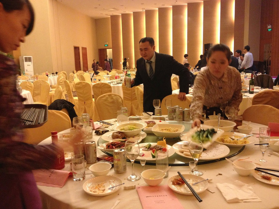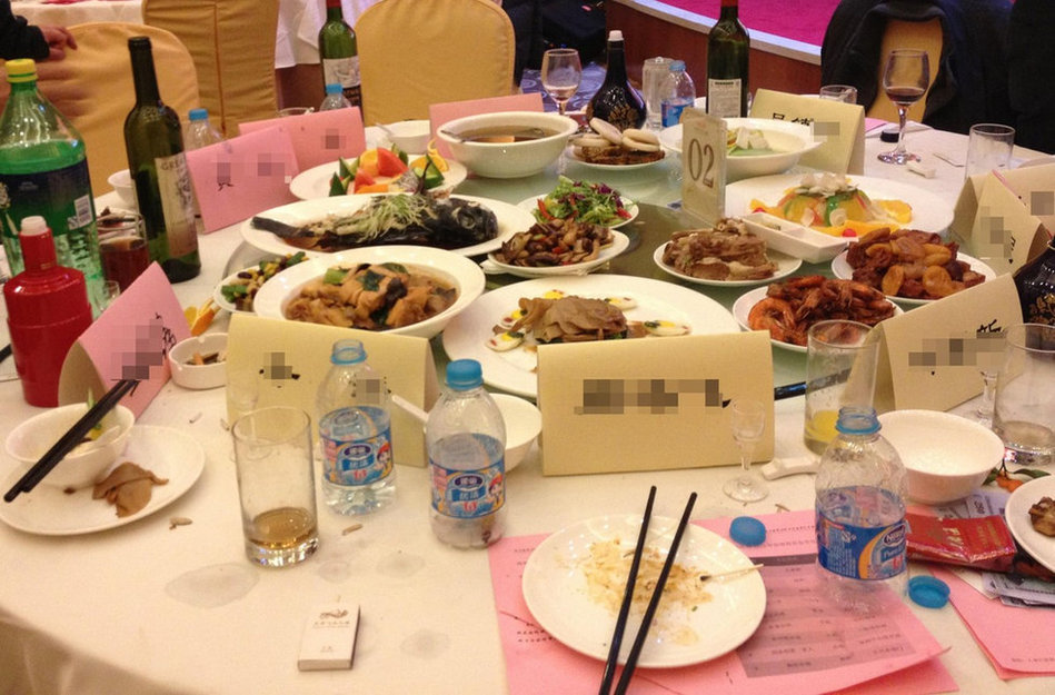 1月25日,北京甘肃驻京办餐厅,某公司迎新晚会上,宴会结束后,领导餐桌上的菜品基本没动过。去年年底,中央出台“八项规定”、“六项禁令”,其中要求 “厉行勤俭节约”、“严禁超标准接待”。日前,记者暗访甘肃、福建、河北、河南、内蒙古、四川等10余家省级驻京办餐厅,大多均被告知,至少3日内餐厅的 包间和宴会厅都已预订一空,“主要都是国企和政府部门的公务接待和年会”。