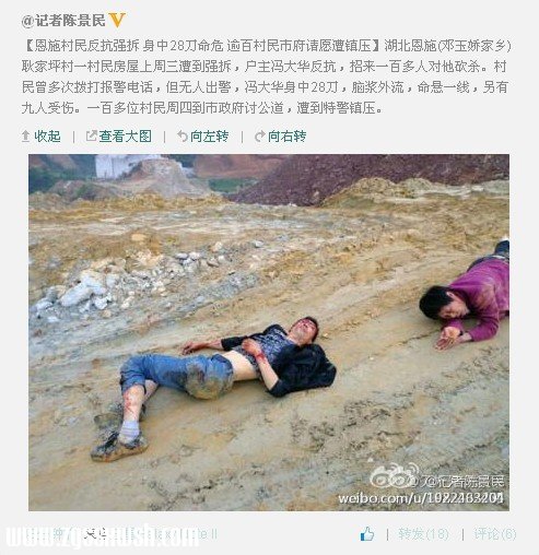 【恩施村民反抗强拆 身中28刀命危 逾百村民市府请愿遭镇压】湖北恩施(邓玉娇家乡)耿家坪村一村民房屋上周三遭到强拆,户主冯大华反抗,招来一百多人对他砍杀。村民曾多次拨打报警电话,但无人出警,冯大华身中28刀,脑浆外流,命悬一线,另有九人受伤。一百多位村民周四到市政府讨公道,遭到特警镇压。