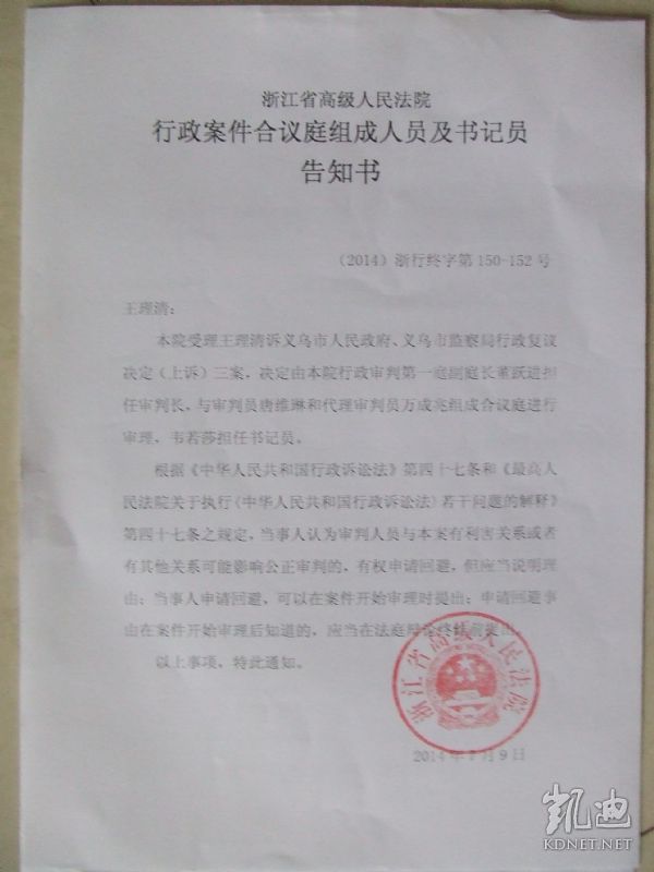 王理清与2013年多次向义乌市监察局提起依法行政申请,要求查处义乌市治安大队长吴璀赛、市政府办公室副主任龚应浩、江东街道办事处信访办主任金龙的违法违纪问题。但是,监察局收到申请书后拒不履行法定职责。申请人于2014年3月3日提出行政复议,复议机关又以不是复议范畴驳回申请,申请人不服提起起诉,金华市中级人民法院又是驳回起诉人的请求。
