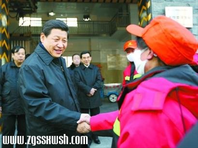 2013年2月8日,习近平在西城区环境卫生服务中心手帕口清洁站看望一线环卫工人并与他们亲切握手。